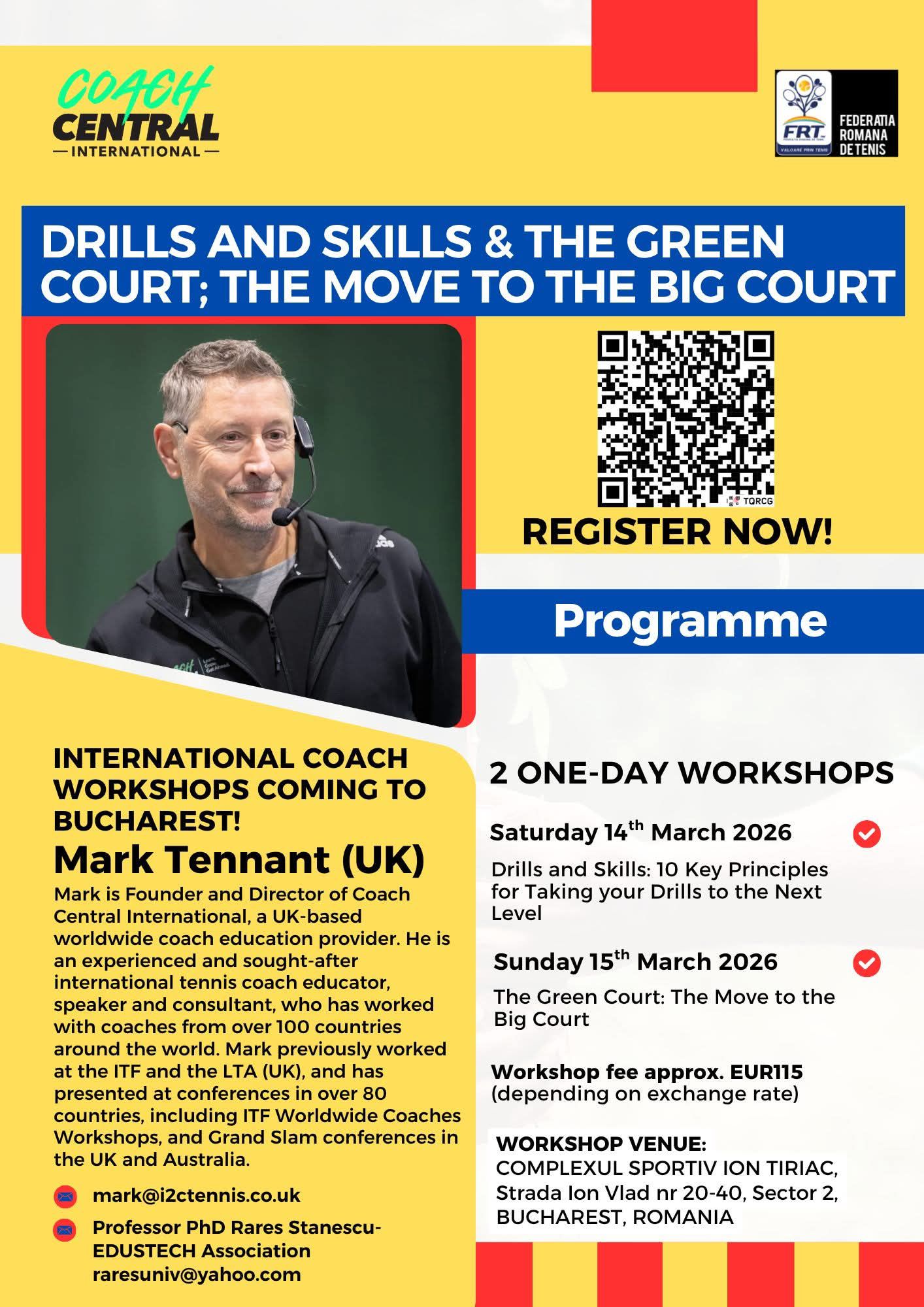 Bucureștiul va găzdui, în perioada 14–15 martie 2026, două workshop-uri internaționale dedicate antrenorilor de tenis, susținute de reputatul specialist britanic Mark Tennant, fondator și director al Coach Central International.